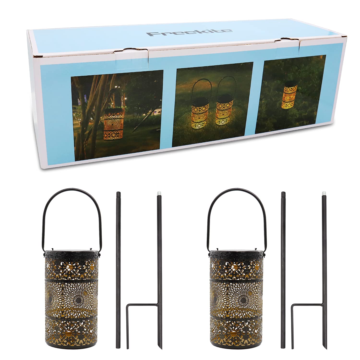 Brand: Freekite | Color: Black | Features: Well-made metal with anti-rust, weatherproof solar panels. Auto on/off switch charges by day, lights at dusk. 5-8 hours solar charging for 8 hours of light. Easy to assemble: hang, stake, or place on tables. Perfect for garden paths, steps, or as a gift. Specs: Lantern: 4.52" (diameter), 8.11" (height); Bracket: 25.07". Material: Metal. Battery: 1 Ni-MH AA 1000mAh 1.2v. Solar-powered. Includes: 2 lanterns, 4 stakes, manual. Package: 17.3 x 5.9 x 5.5 inches.