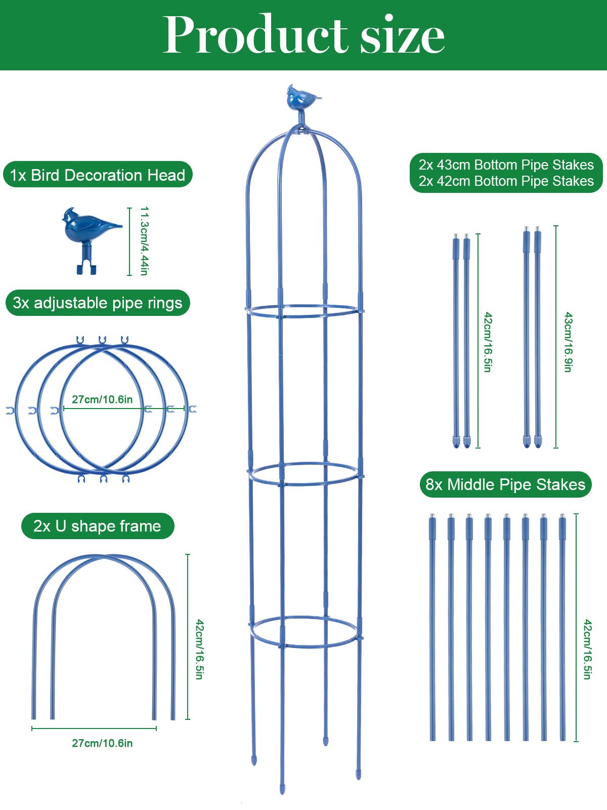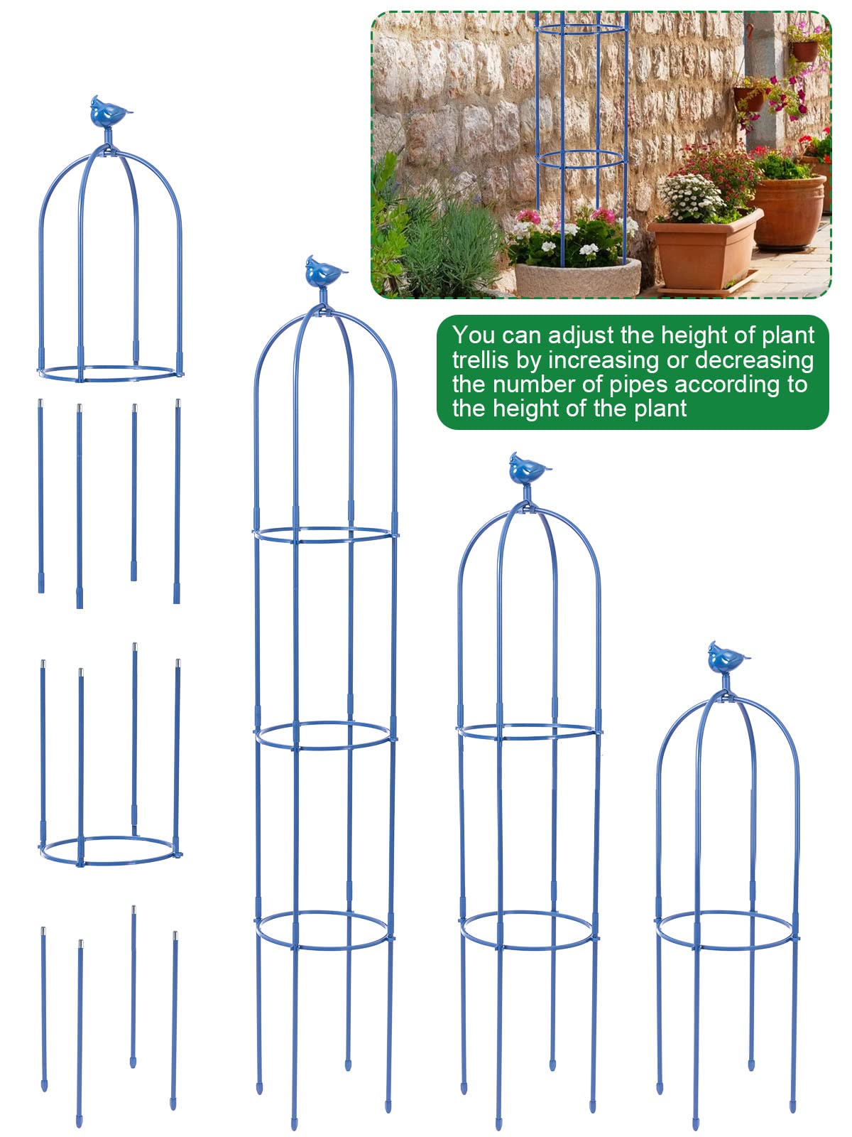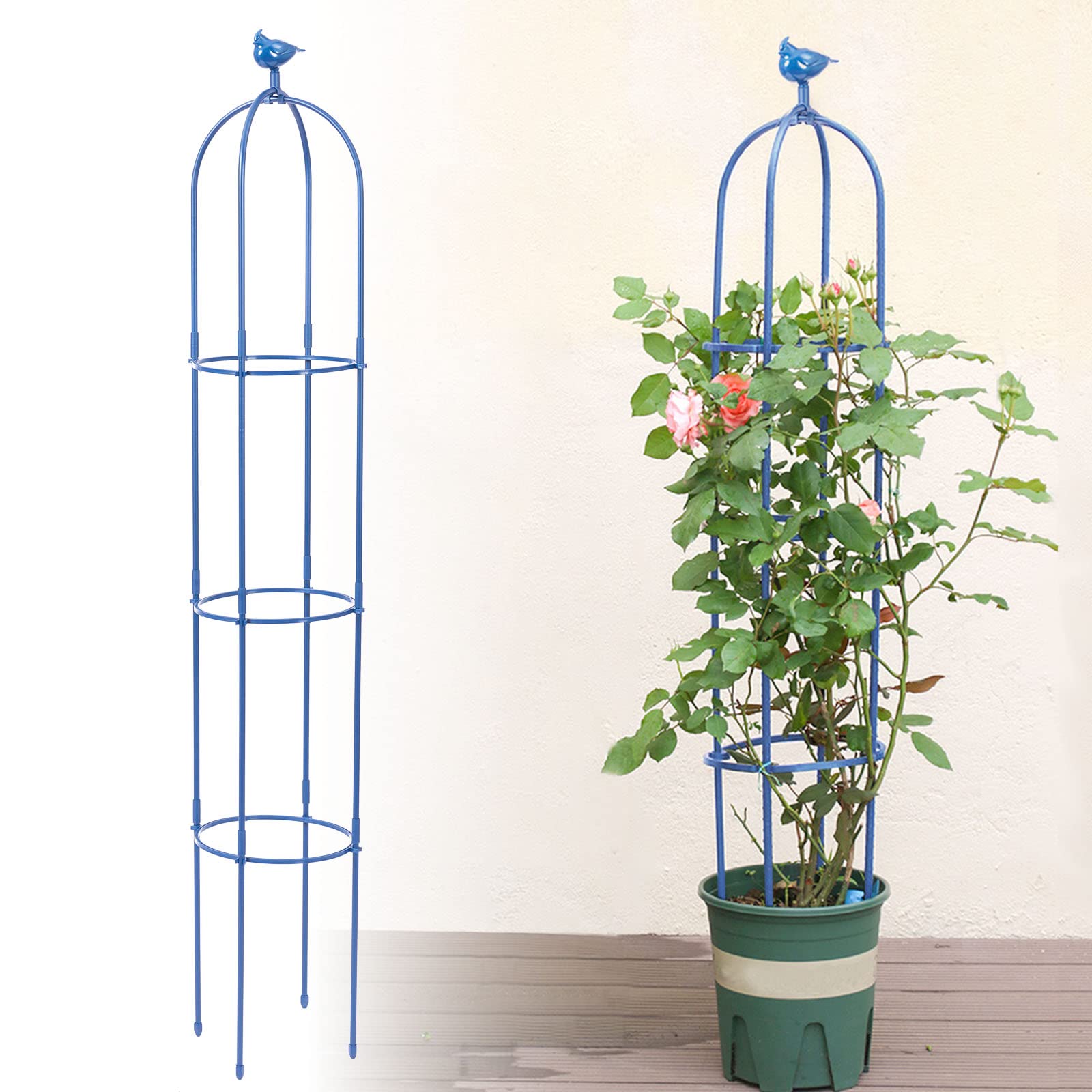 Brand: Kalolary | Color: Blue | Features: 1.8m metal trellis with bird head decoration. Made of rustproof stainless steel, ideal for indoor/outdoor use. Easy assembly with 4 stakes of varying lengths for balance. Adjustable height with 3 pipe rings. Suitable for supporting flowers, vegetables, vines, and more. Includes: Bird head, 4 bottom stakes, 8 middle stakes, 2 U-frames, 3 adjustable rings, and manual. Package Dimensions: 17.2 x 12.8 x 2.2 inches.