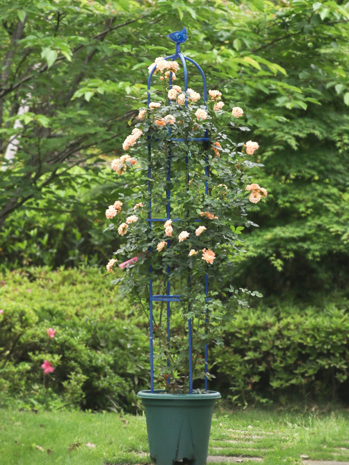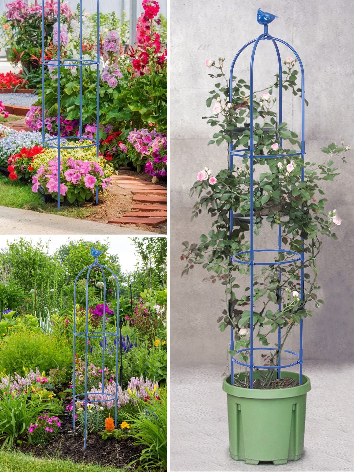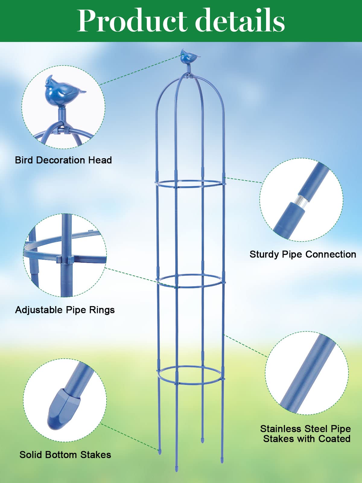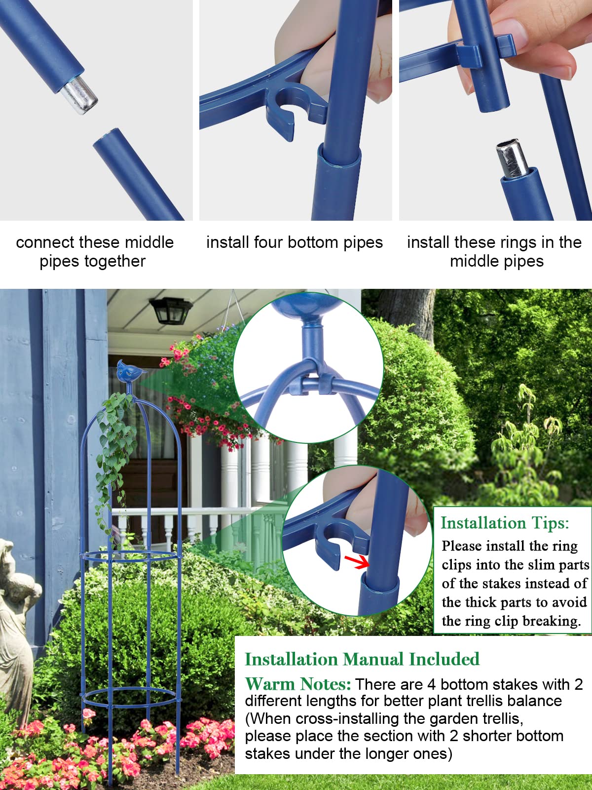 Brand: Kalolary | Color: Blue | Features: 1.8m metal trellis with bird head decoration. Made of rustproof stainless steel, ideal for indoor/outdoor use. Easy assembly with 4 stakes of varying lengths for balance. Adjustable height with 3 pipe rings. Suitable for supporting flowers, vegetables, vines, and more. Includes: Bird head, 4 bottom stakes, 8 middle stakes, 2 U-frames, 3 adjustable rings, and manual. Package Dimensions: 17.2 x 12.8 x 2.2 inches.