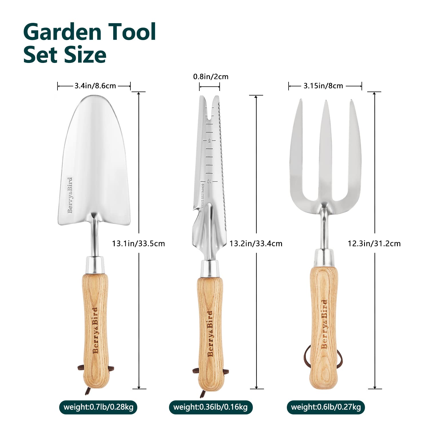 Brand: Berry&Bird | Color: 3pcs Garden Tool | Features: 3-piece stainless steel gardening set includes trowel, hand fork, and weeder. Durable, rust-resistant, ergonomic wooden handles. Ideal for digging, weeding, aerating, and transplanting. Includes cowhide lanyard for easy storage. Model: Garden Tool Set | Package Dimensions: 14.3 x 4.6 x 2.7 inches.