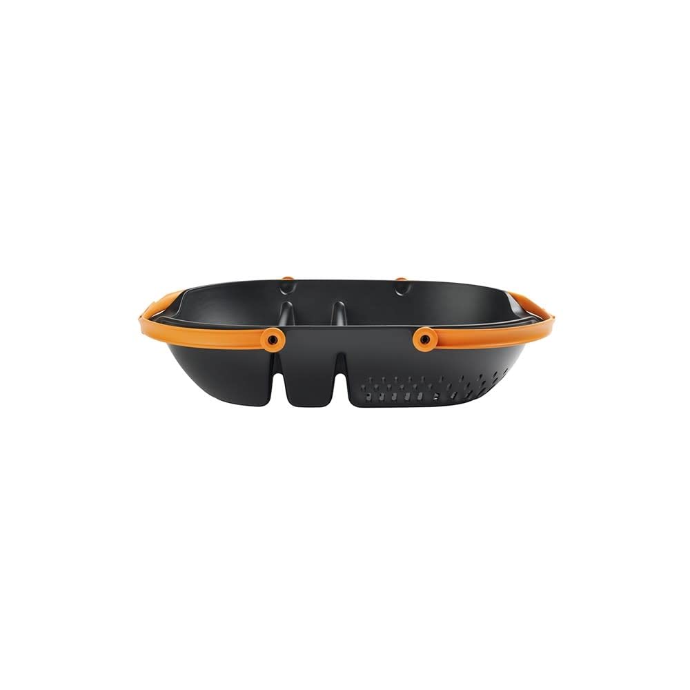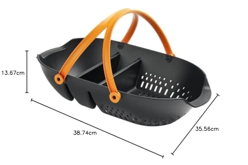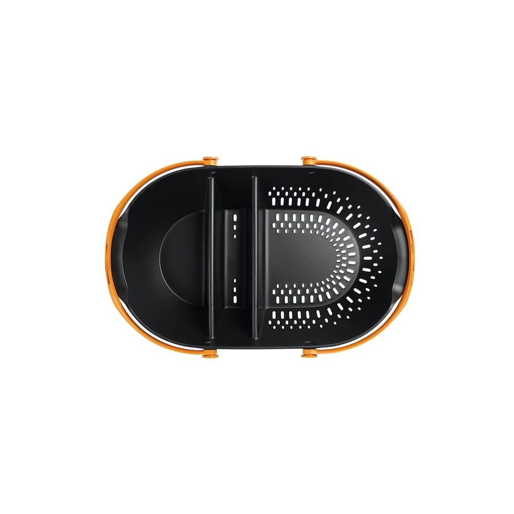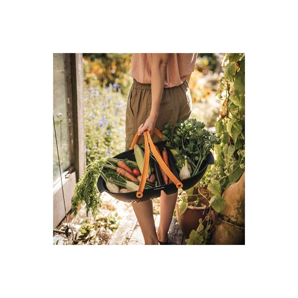 Fiskars Harvest Basket, Noir – Durable plastic basket with ergonomic handles for easy collecting, transporting, and cleaning harvested produce or tools. Features a colander side with drain holes and an enclosed side for soaking or carrying clean items. Long-lasting construction, folding handles for comfortable use, and backed by a Lifetime Warranty. Dimensions: 23.9 x 15.2 x 5.5 inches.