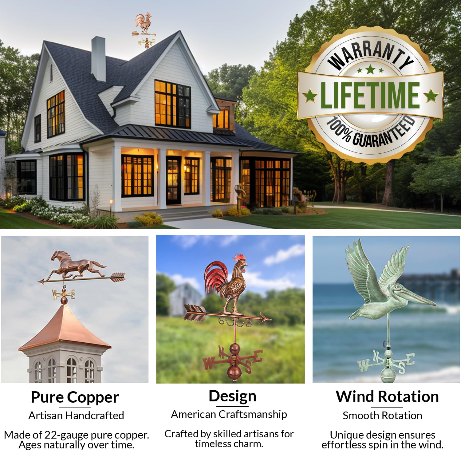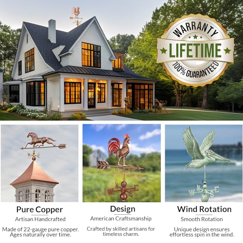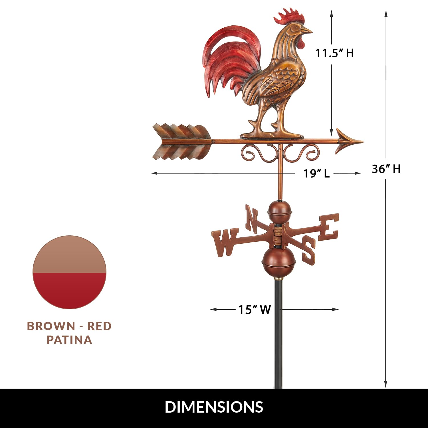 Good Directions Bantam Red Rooster Weathervane – Pure Copper with red/bronze patina, 19" L x 36" H x 15" W. Includes assembly rod, brass directionals, and copper globes. Handcrafted 22-gauge copper, Lifetime Warranty. Dimensions: 18.9 x 18.5 x 4.3 inches.
