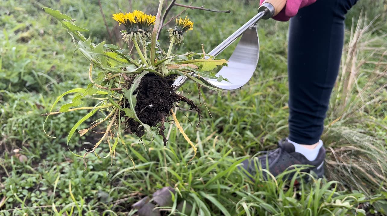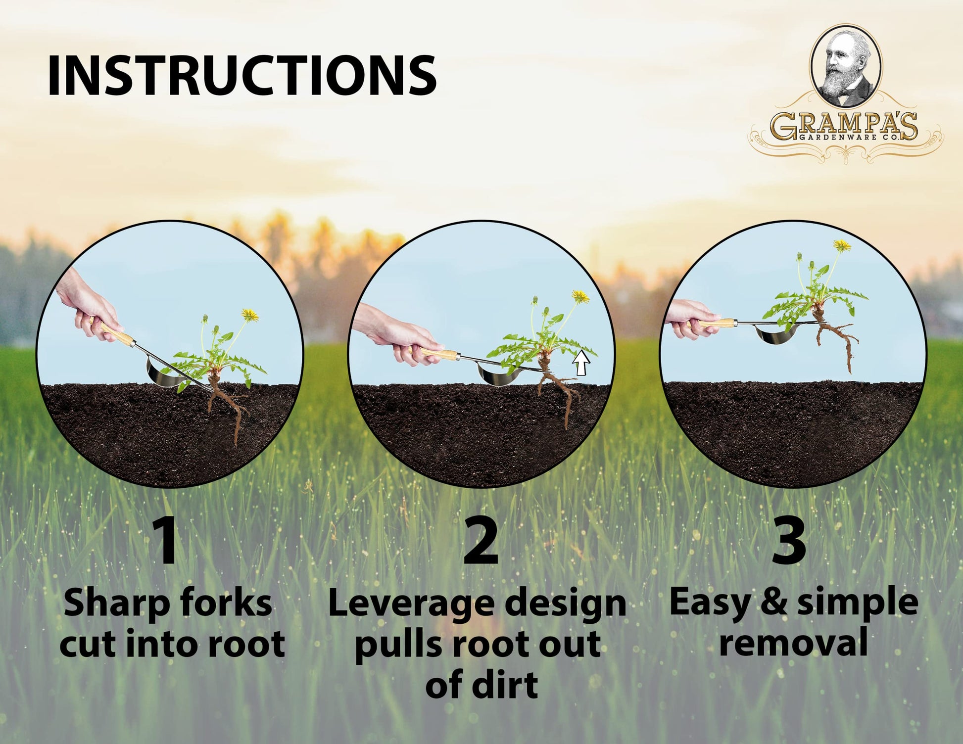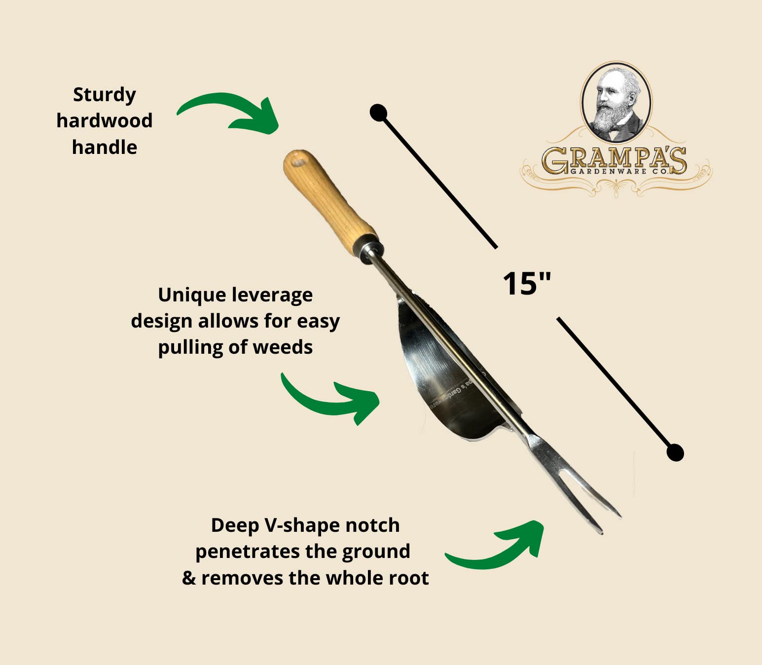 Grampa's Hand Weeder Tool – Durable stainless steel with rust-resistant finish, ergonomic wood handle, and unique lever design for easy weed removal. Ideal for thistles, dandelions, and crabgrass. Dimensions: 16.5 x 3.5 x 3.5 inches.