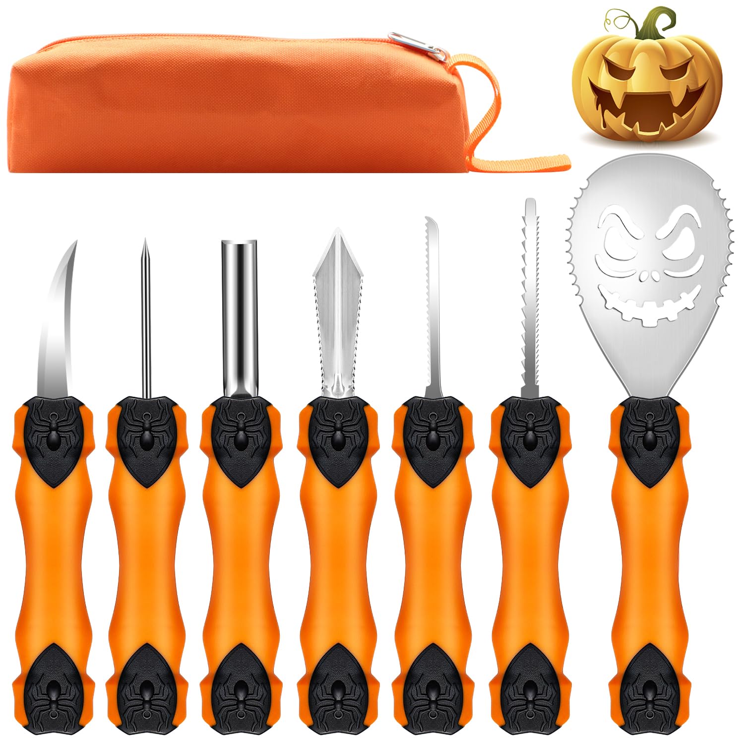 Henscoqi 7-Piece Pumpkin Carving Kit – Includes stainless steel tools with rubber handles: saws, scooper, drill, gouge, etching tool, curved knife, and storage bag. Durable and safe for family fun. Dimensions: 9.5 x 4.7 x 2.0 inches.