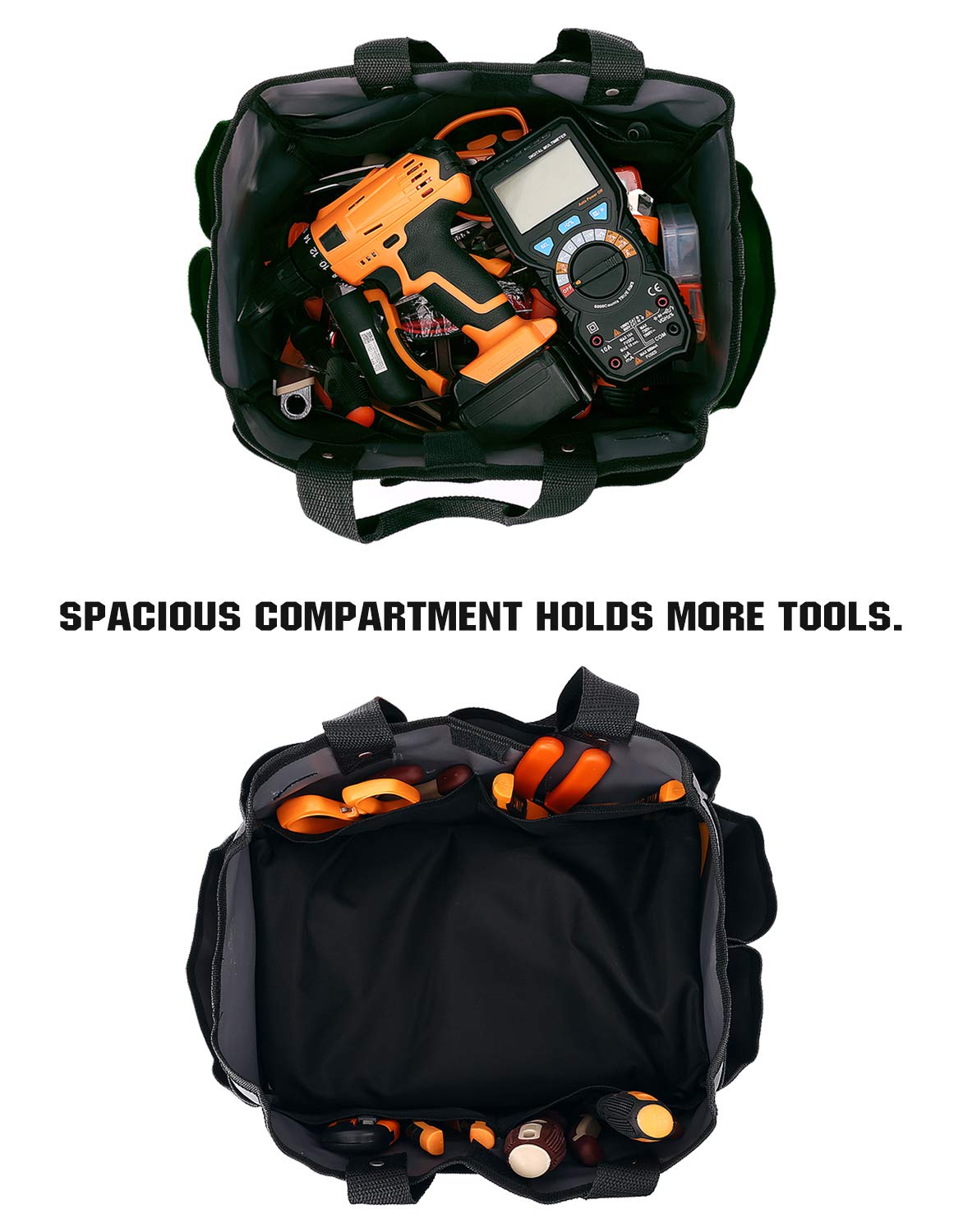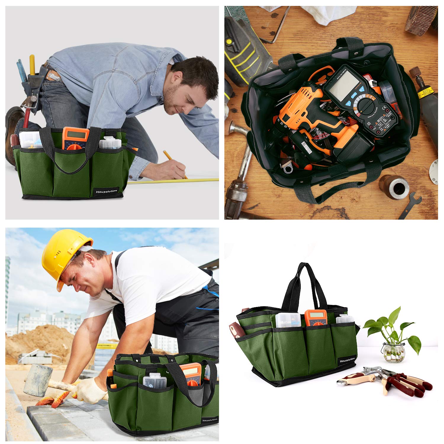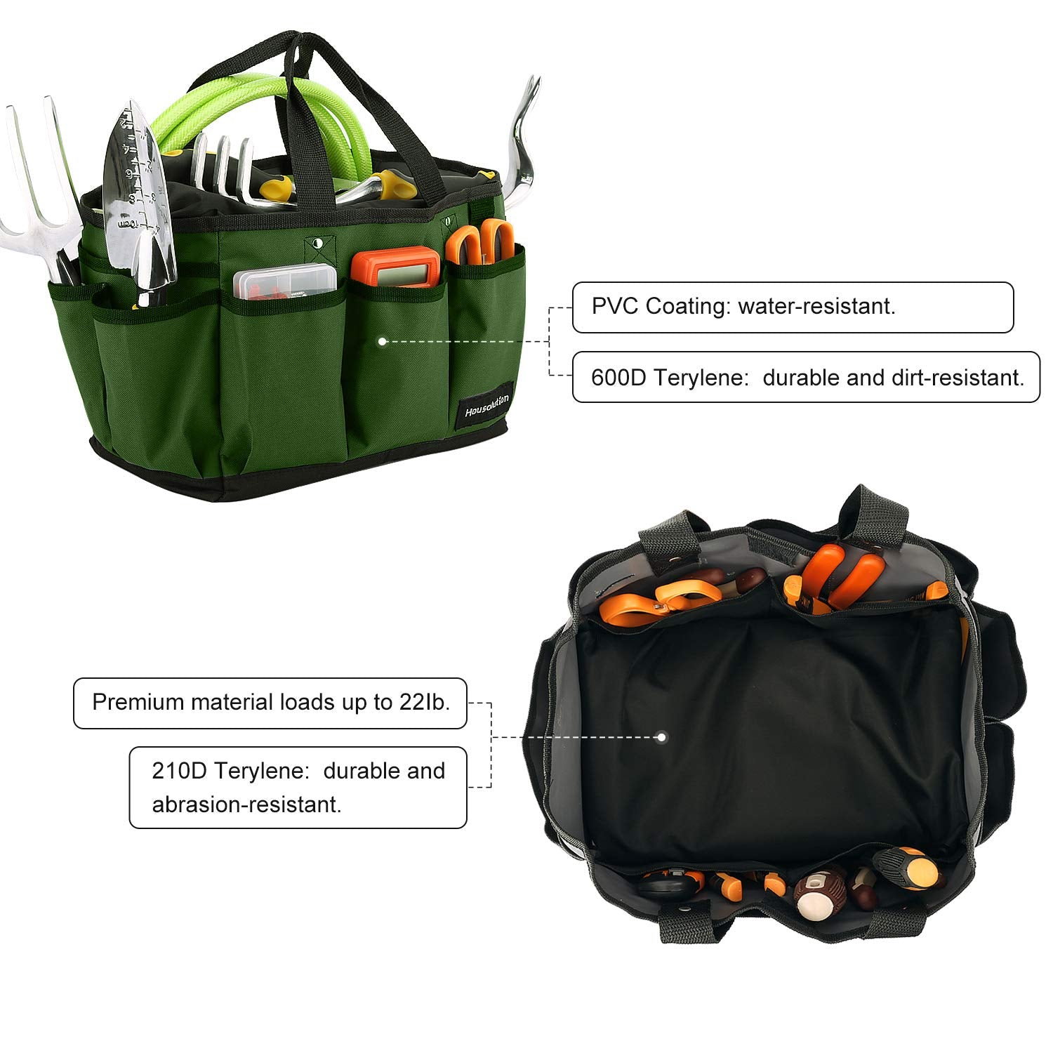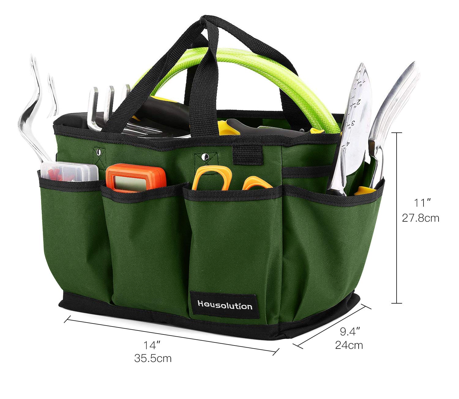 Housolution 14" Gardening Tote Bag – Made of durable 600D polyester, with large capacity (14 x 10.9 x 9.4 inches) and multiple pockets for easy tool storage. Wear-resistant, reusable, perfect for gardening or home use. Package Dimensions: 12.5 x 7.2 x 1.6 inches.
