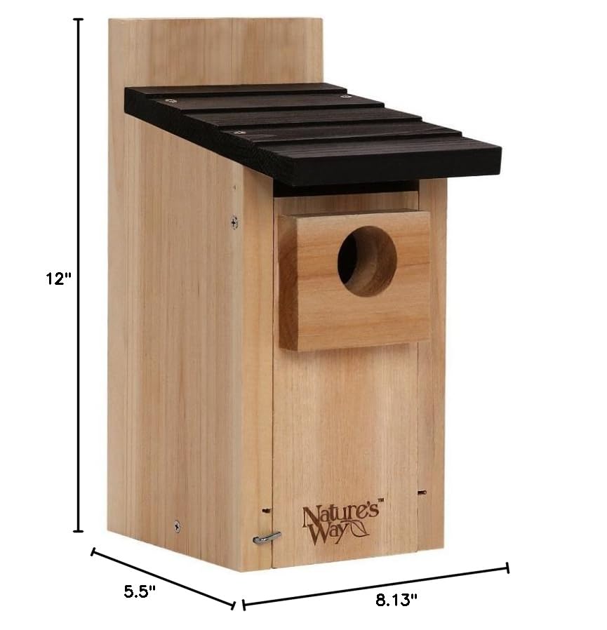 Nature's Way CWH3 Cedar Bluebird Box House – Made from insect and rot-resistant cedar with rust-free hardware, air vents, clean-out doors, and a predator guard. Pole or flush mount installation. Dimensions: 11.9 x 8.1 x 7.3 inches.