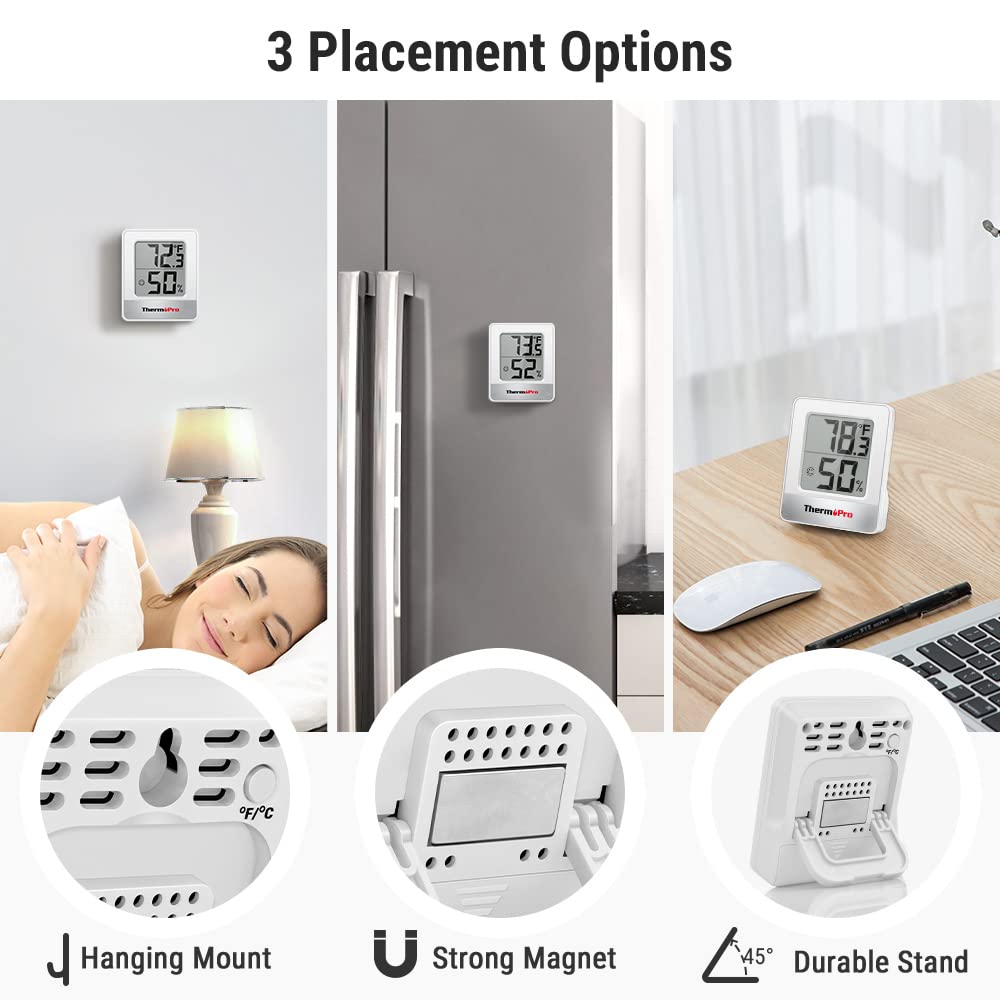 ThermoPro TP49 Digital Hygrometer – Features face icon comfort indicator, highly accurate sensors (+/-1°F, +/-2%-3%RH), 10-sec refresh rate, and compact display. 3 placement options: tabletop, magnetic, or hanging. Dimensions: 3.0 x 2.4 x 0.9 inches.