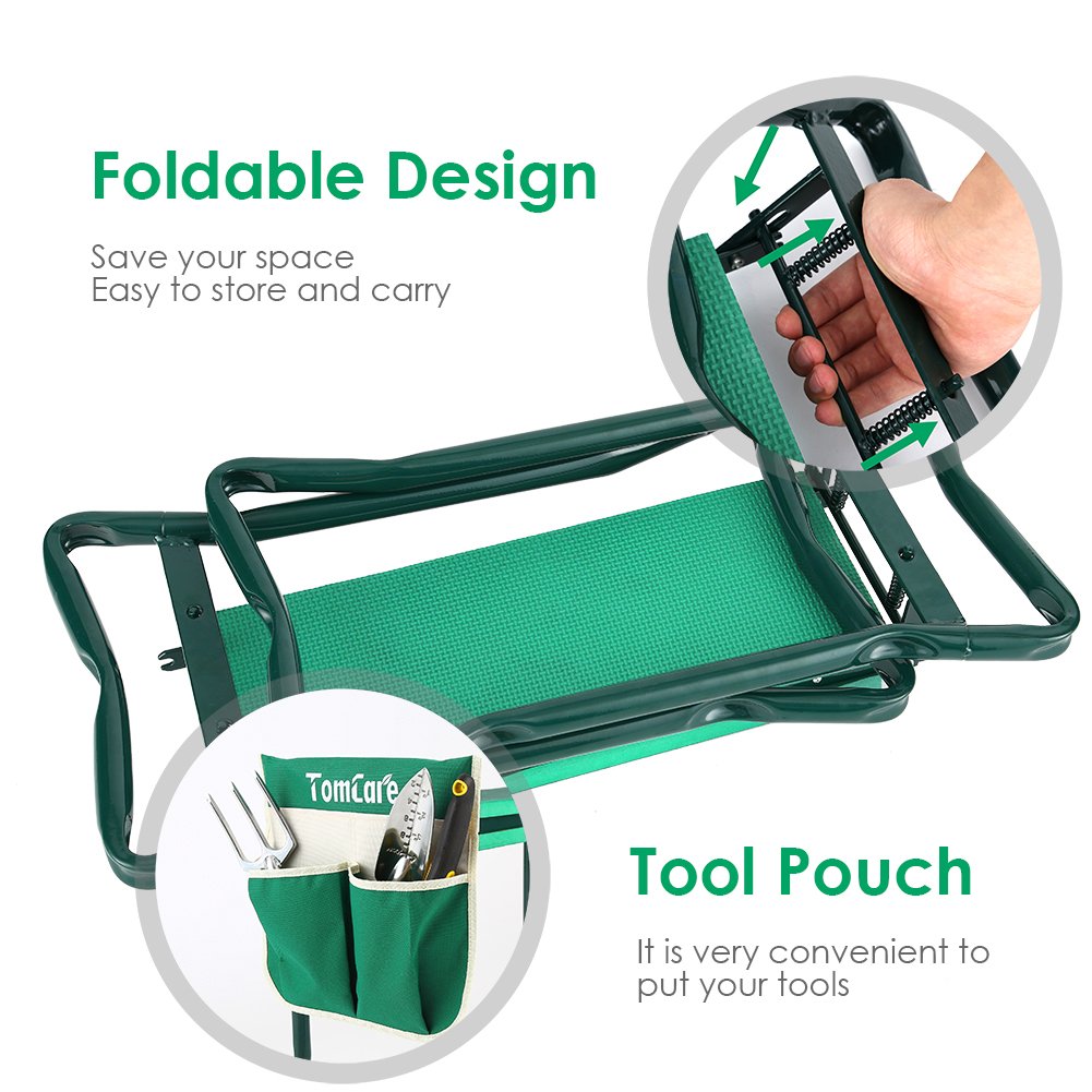 TomCare Garden Kneeler Seat – Multi-functional kneeler and seat with 2 tool bags (4 & 3 pockets). Foldable, lightweight, and durable with foam-padded cushion. Max weight 330 lbs. Package dimensions: 21.65"x10.62"x18.89".