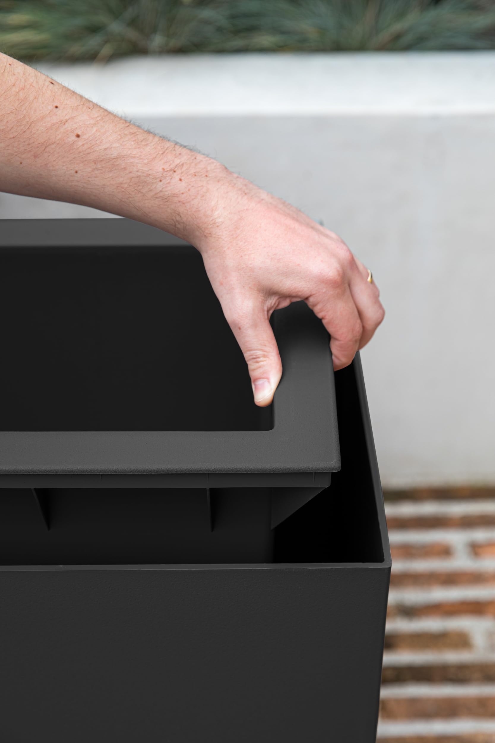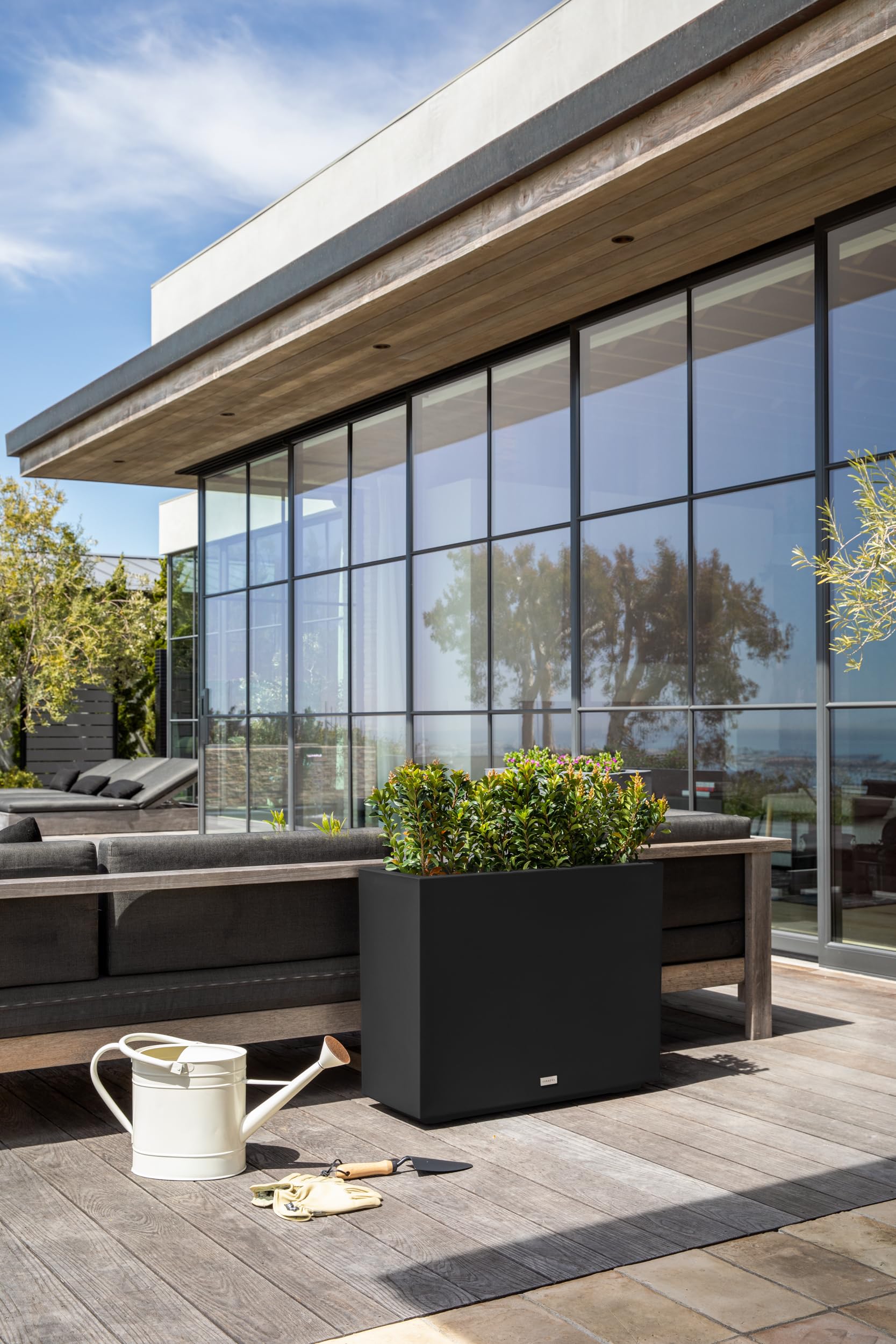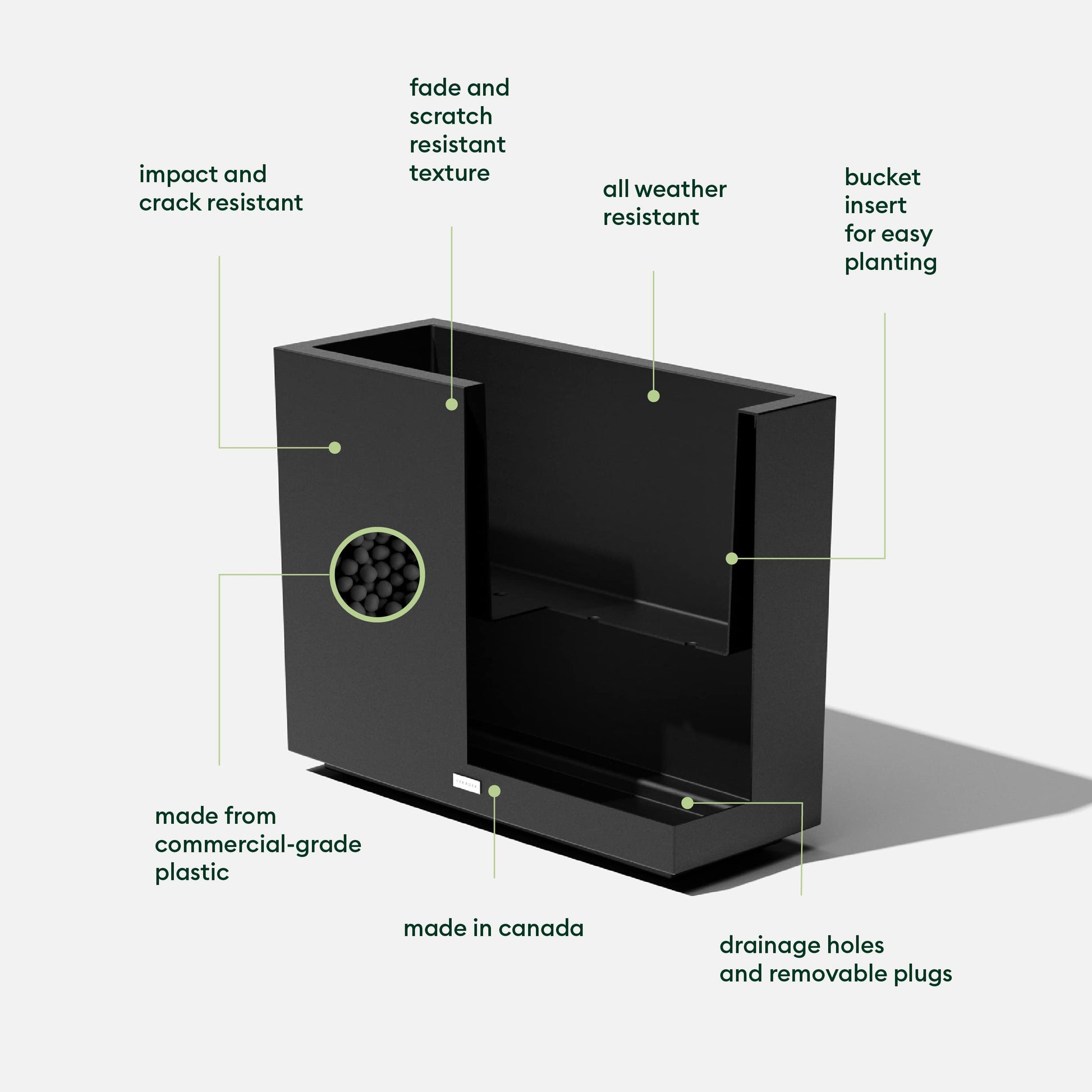Veradek Block Series Tall Planter – Made from durable, all-weather plastic, resistant to cracks and UV fading. Exterior: 24.25"H x 12"W x 30"L. Includes removable insert bucket (12.85"H x 9"W x 27"L). Modern design, lightweight, perfect for indoor/outdoor use. Made in Canada. Package: 32.0 x 26.0 x 14.0 inches.