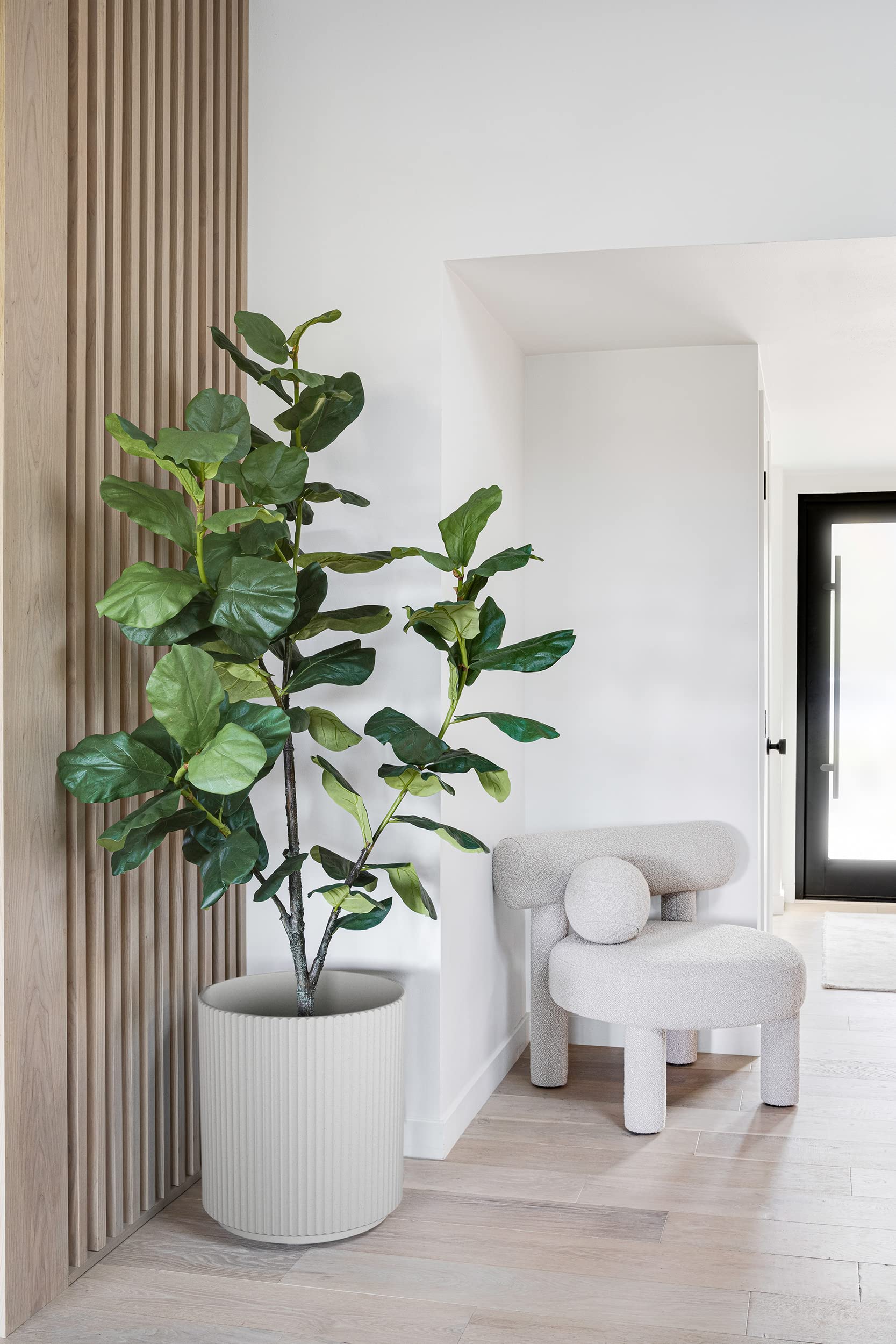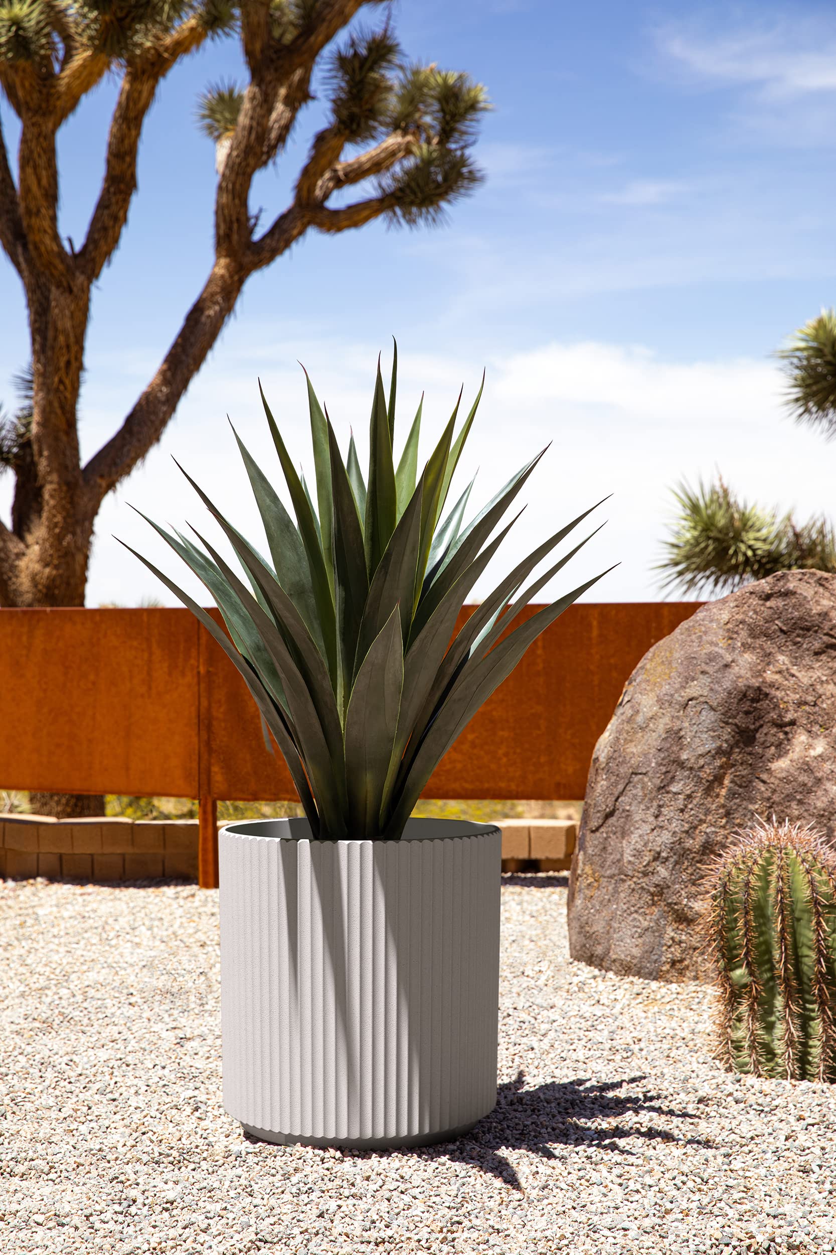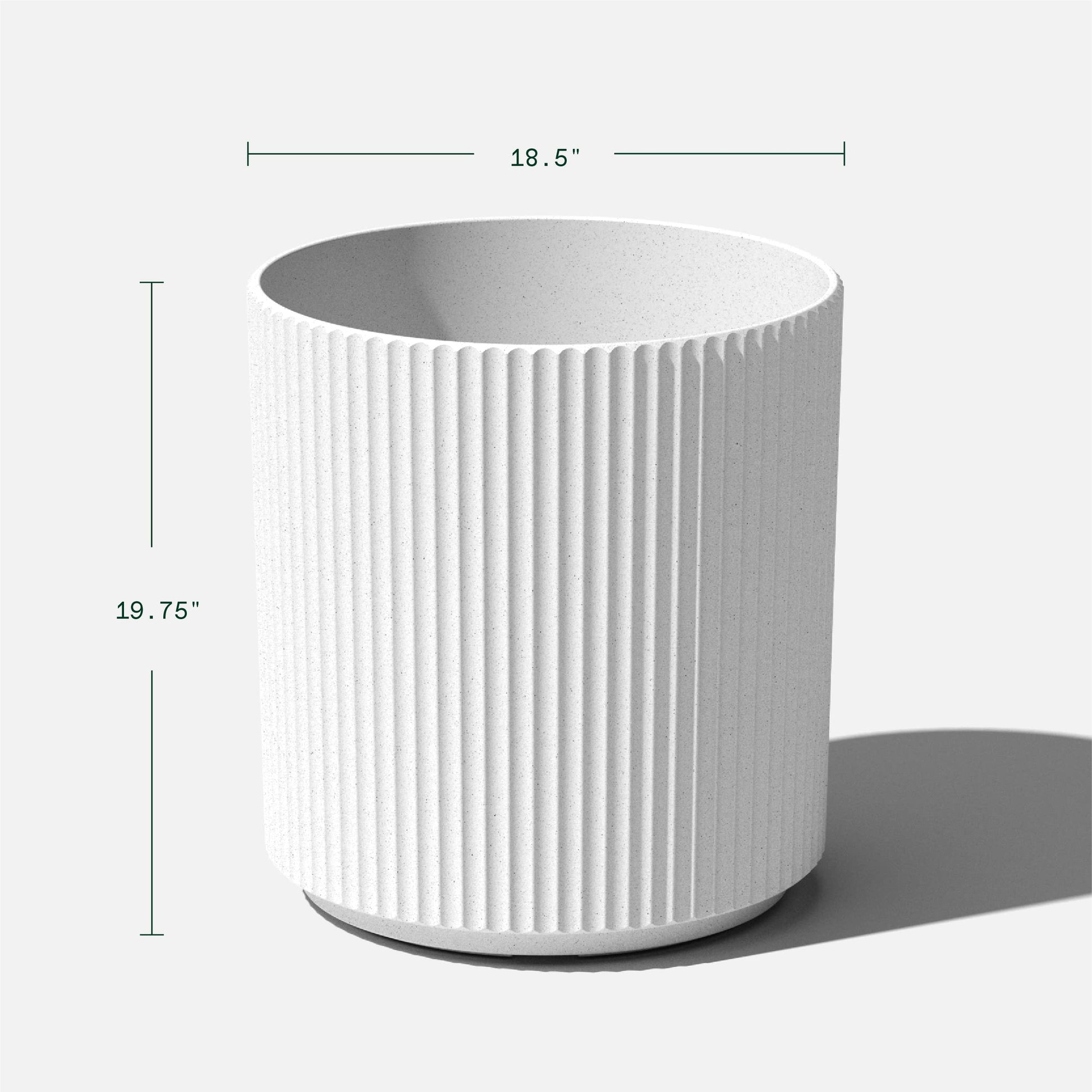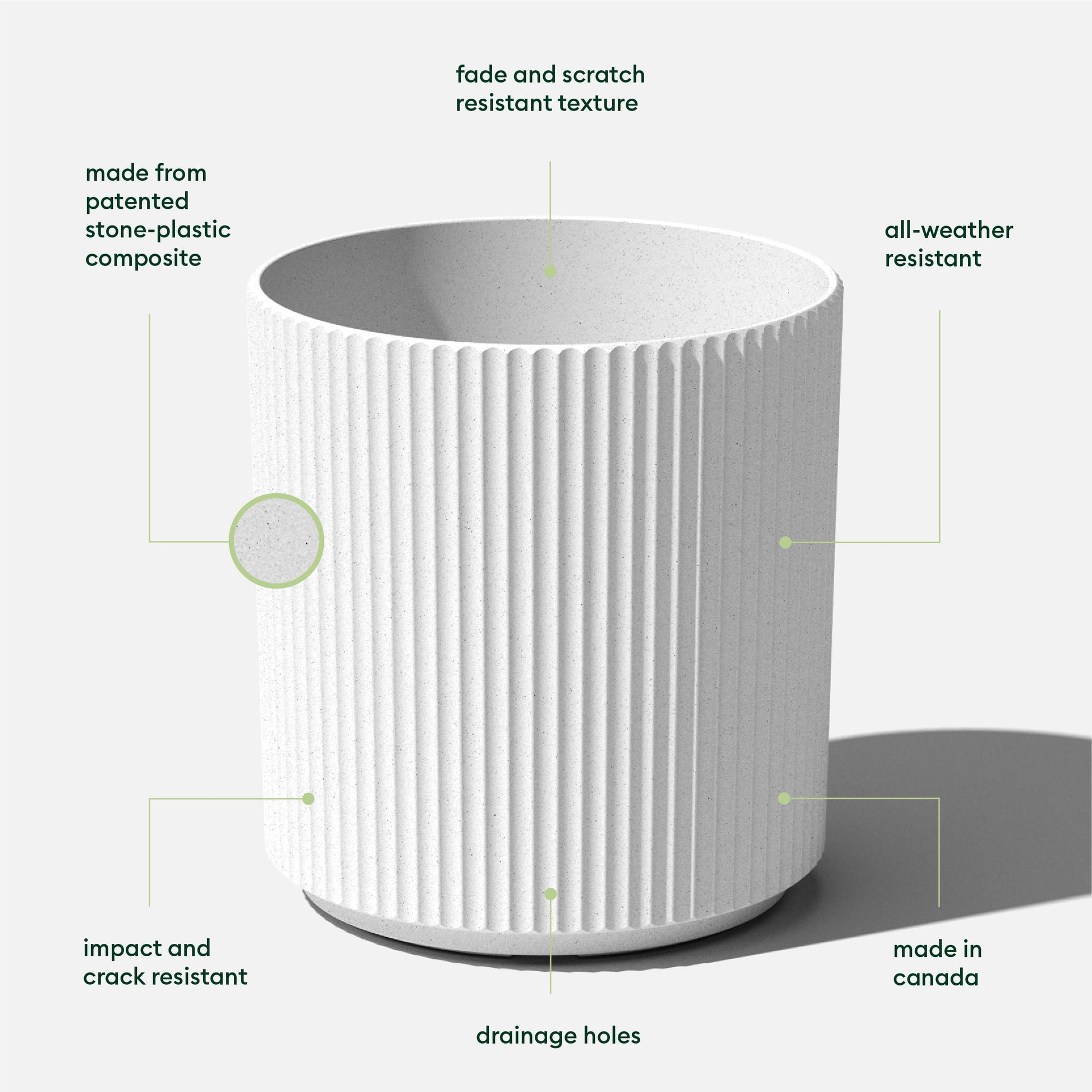 Veradek Demi Planter – Made from a durable plastic-stone composite with a textured finish, weather-resistant to cracks, UV, and fading. 18.5"D x 20"H with pre-drilled drainage holes. Modern design for indoor/outdoor use. Made in Canada. Package: 21.3 x 19.0 x 19.0 inches.