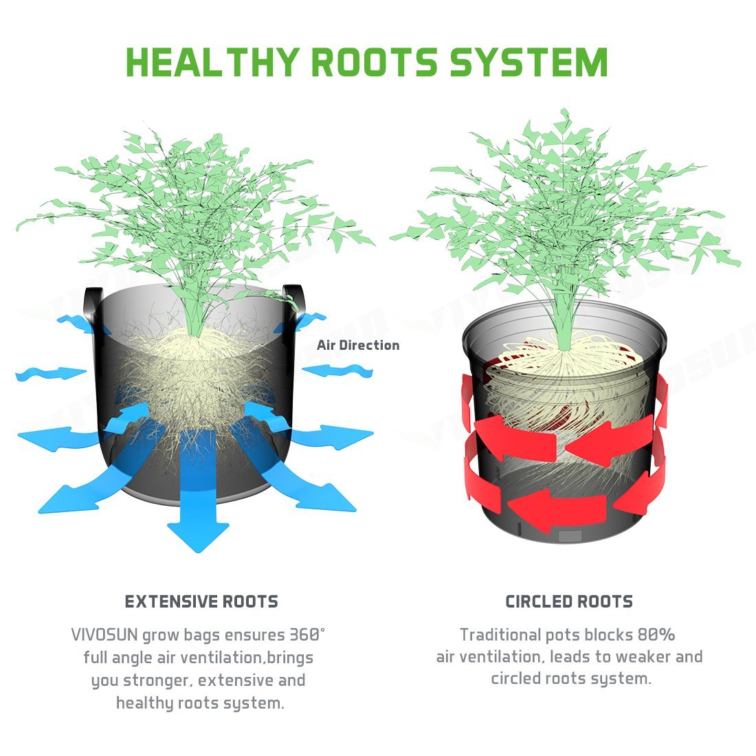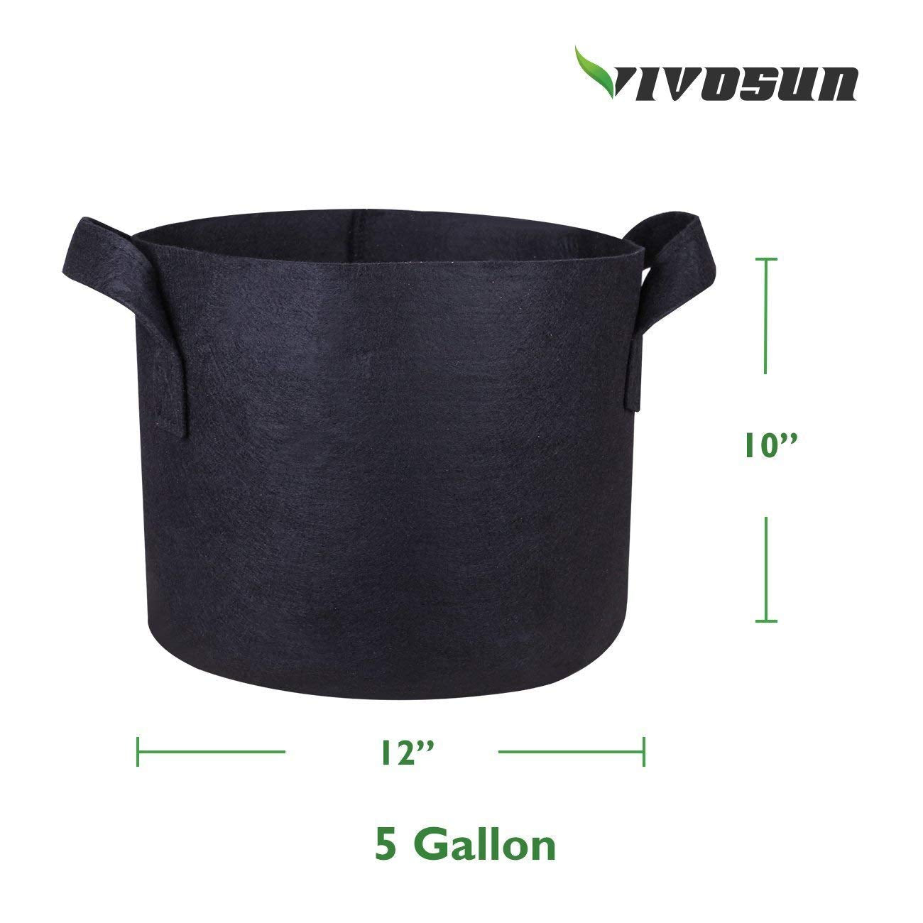 Brand: VIVOSUN | Color: Black | Features: Thicker 300 GSM nonwoven fabric for insulation, moisture retention, and root aeration. Reinforced handles for easy lifting. Promotes healthy root growth and effortless transplants. Durable for years of use in balcony, porch, or garden. Model: 311001 | Dimensions: 10.5 x 7.4 x 2.8 inches.